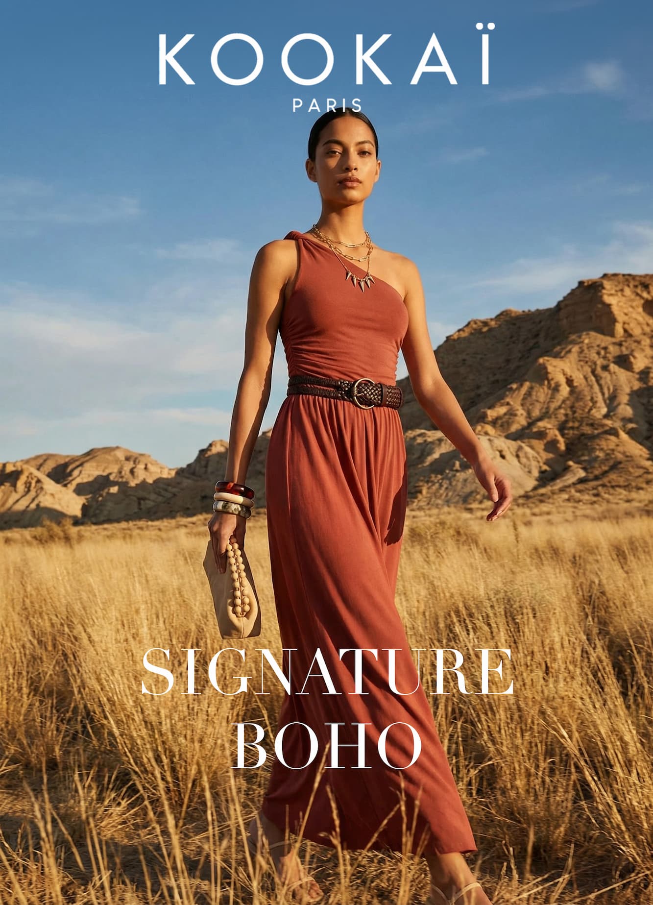L’allure bohème, twistée, revisitée dans l'esprit KOOKAÏ . Coupes aériennes, matières en mouvement, colorama vintage... Des silhouettes lumineuses avec du terracotta brûlé, du brun vibrant et du beige solaire.